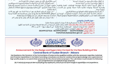 يدعو السيد/ المدير العام للشؤون المالية والإدارية بوزارة الصحة الاتحادية السادة الشركات أو أسماء الاعمال للتقديم عروضهم لشراء وتوريد وتركيب أجهزة ومعدات طبية لاقسام المستشفيات (الطوارئ – العناية المكثفة – العملية – المعمل ) حسب الكميات الموضحة بكراسة العطاء ،وذلك وفقاً لأحكام قانون الشراء والتعاقد لسنة 2010م واللائحة المفسرة لسنة 2011م بجمهورية السودان والوثائق النموذجية وفقاً للمواصفات الفنية المطلوبة فى كراسة العطاء،والذي سيتم التقديم له بمقر وارة الصحة الاتحادية بورتسودان شارع بنك السودان المركزي شرق إدارة الرقابة البحرية وفرع البنك الفرنسي وفق الخطوات التالية: