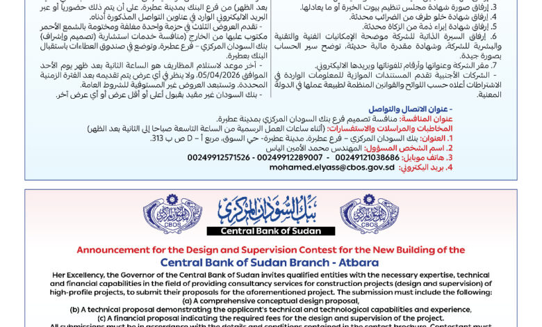 الرئيسية|اعلانات|اعلان :بنك السودان المركزي. منافسة تصميم وإشراف مشروع المبنى الجديد لبنك السودان المركزي فرع عطبرة اعلانات اعلان :بنك السودان المركزي. منافسة تصميم وإشراف مشروع المبنى الجديد لبنك السودان المركزي فرع عطبرة فبراير 12, 20260 4 أقل من دقيقة نسخ الرابط تم نسخ الرابط فبراير 12, 20260 4 أقل من دقيقة فيسبوك X ماسنجر ماسنجر واتساب تيلقرام مشاركة عبر البريد