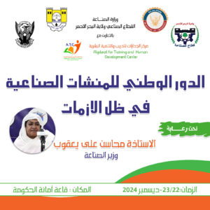 تنظم وزارة الصناعة.القطاع الصناعي ولاية البحر الأحمر بالتعاون مع مركز الجدارات للتدريب والتنمية البشرية الملتقى التطويري عن الدور الوطني للمنشآت الصناعية في ظل الأزمات برعاية وزير الصناعة محاسن علي يعقوب في الفترة من 22-23ديسمبر الجاري بأمانة حكومة ولاية البحر الأحمر