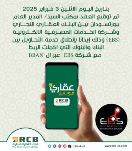 وقع البنك العقاري التجاري وشركة الخدمات المصرفية الإلكترونية(EBS) برئاسة البنك ببورتسودان عقدا تمهيدا لانطلاق خدمة التحاويل بين البنك والبنوك التي أكملت الربط مع شركة EBSعبر BBAN