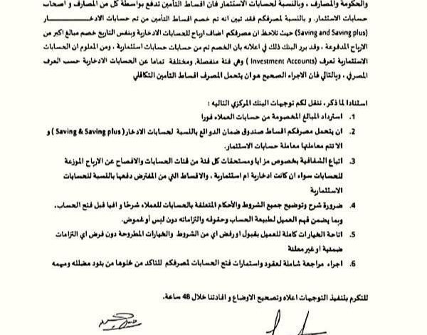 وتمثلت التوجيهات في إيقاف خصم أي مبالغ تحت مسمى مساهمات أو رسوم صندوق ضمان الودائع وإرجاع جميع المبالغ التي تم خصمها سابقا لهذا الغرض بجانب منع الاستقطاع من الحسابات الجارية أو الادخارية.