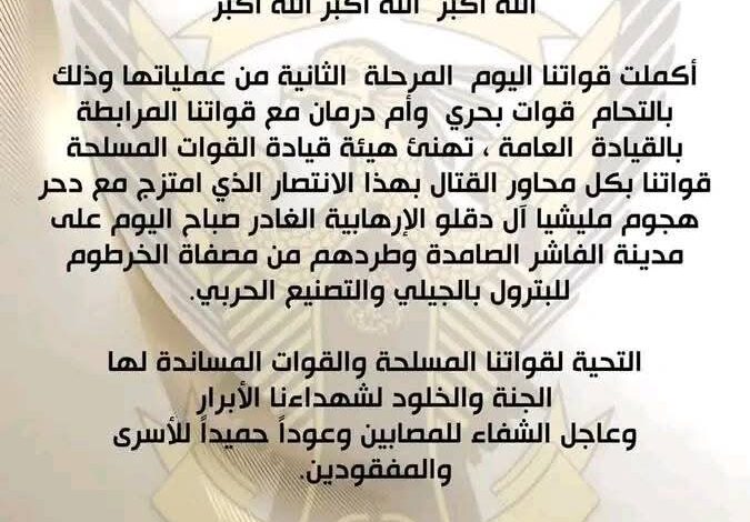 وأشادت هيئة قيادة القوات المسلحة بهذا الإنجاز، مشيرة إلى أنه تزامن مع دحر هجوم شنّته مليشيا آل دقلو الإرهابية صباح اليوم على مدينة الفاشر، وطردهم من مصفاة الخرطوم للبترول بمنطقة الجيلي ومنشآت التصنيع الحربي.