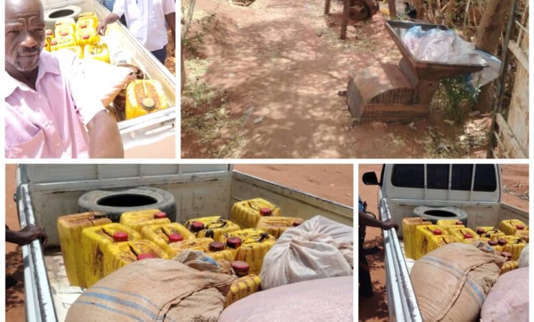 تمت مداهمة الموقع وهو عباره عن منزل حيث ضبط المتهم( م ع ا) وهو يقوم بعصر حبيبات التبلدي وخلطها مع قشر الفول السوداني ومخلفات الانباز وضبط بحوزته عدد (14) جركانه زنة (16) لتر