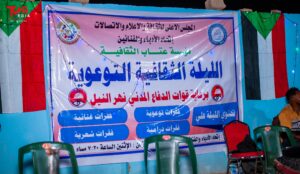 نظم المجلس الأعلى للثقافة والإعلام والاتصالات واتحاد الأدباء والفنانين بالتعاون مع مؤسسة عتاب الثقافية ليلة ثقافية توعوية برعاية قوات الدفاع المدني نهر النيل وشرف الللية المدير لقوات الدفاع المدني العميد أحمد يوسف وممثل مدير شرطة نهر النيل ياسر عبد الحميد ومدير شرطة عطبرة العميد ارتولي. وضباط وضباط صف وجنود قوات الدفاع المدني