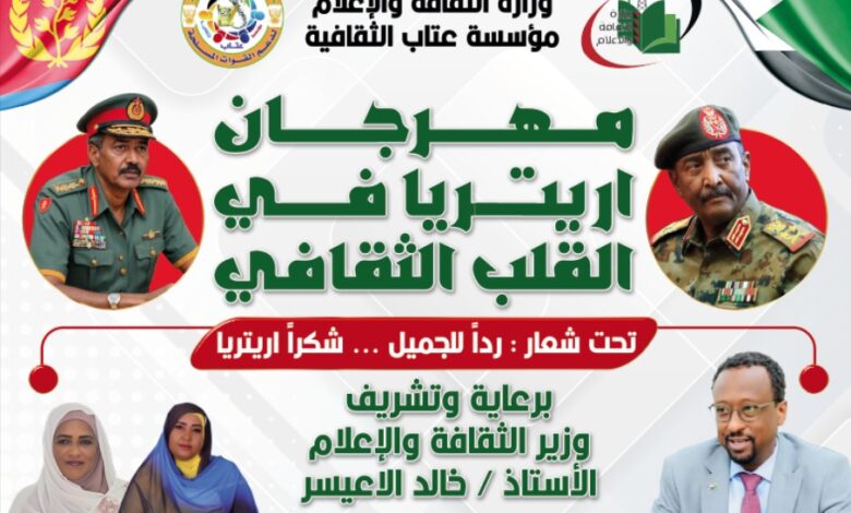 أكدت المدير العام لمؤسسة مؤسسة عتاب الثقافية د(مشاعر البدوي عن اكتمال كافة الترتيبات لانطلاق مهرجان اريتريا في القلب الثقافي تحت شعار ردا للجميل شكرا إريتريا في الفترة من 18-25فبرايرالجاري بدولة اريتريا بمدينة اسمرا برعاية وتشريف وزير الثقافة والاعلام خالد الاعيسر وممثل حكومة ولاية البحر الاحمر وزير السياحة والاستثمار سامية اوشيك