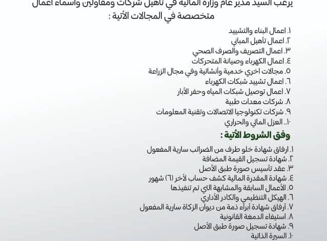 ولاية الخرطوم وزارة المالية والاقتصاد والاستثمار ..مكتب المدير العام..إعلان تأهيل شركات ومقاولين وأسماء أعمال وبيوت خبرة يرغب السيد/ مدير…